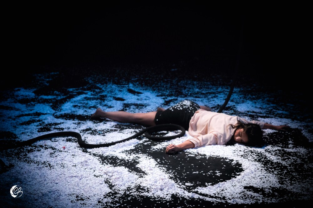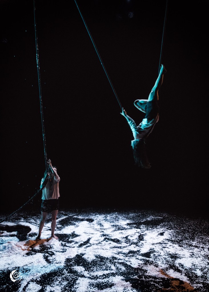 Avec PLONGER (création 2023), Sarah est d’abord agitée par des questions philosophiques. Elle s’attache alors à travailler à une création sensible et théâtrale, dans un univers de piscine désaffectée, où étrangeté, humour et absurde se côtoient. Bien que le corps en suspension reste un de ses langages scéniques essentiel, la question de l’agrès de cirque semble aujourd’hui s’éloigner pour laisser place à une scénographie particulière au projet, mais aussi à un corps qui puisse exprimer tout son potentiel poétique pour tenter, quelque soit la manière, de rendre visible un invisible.